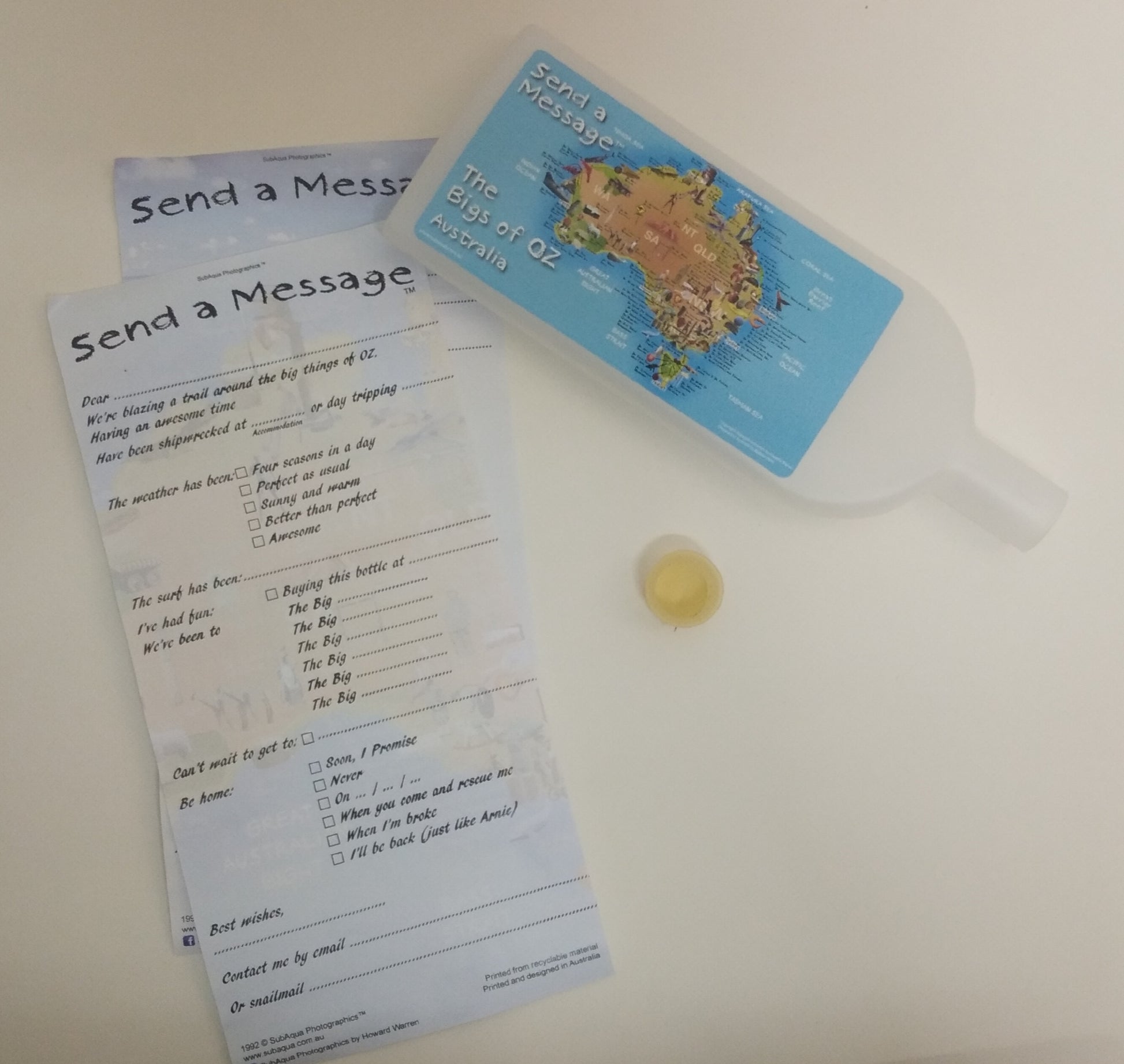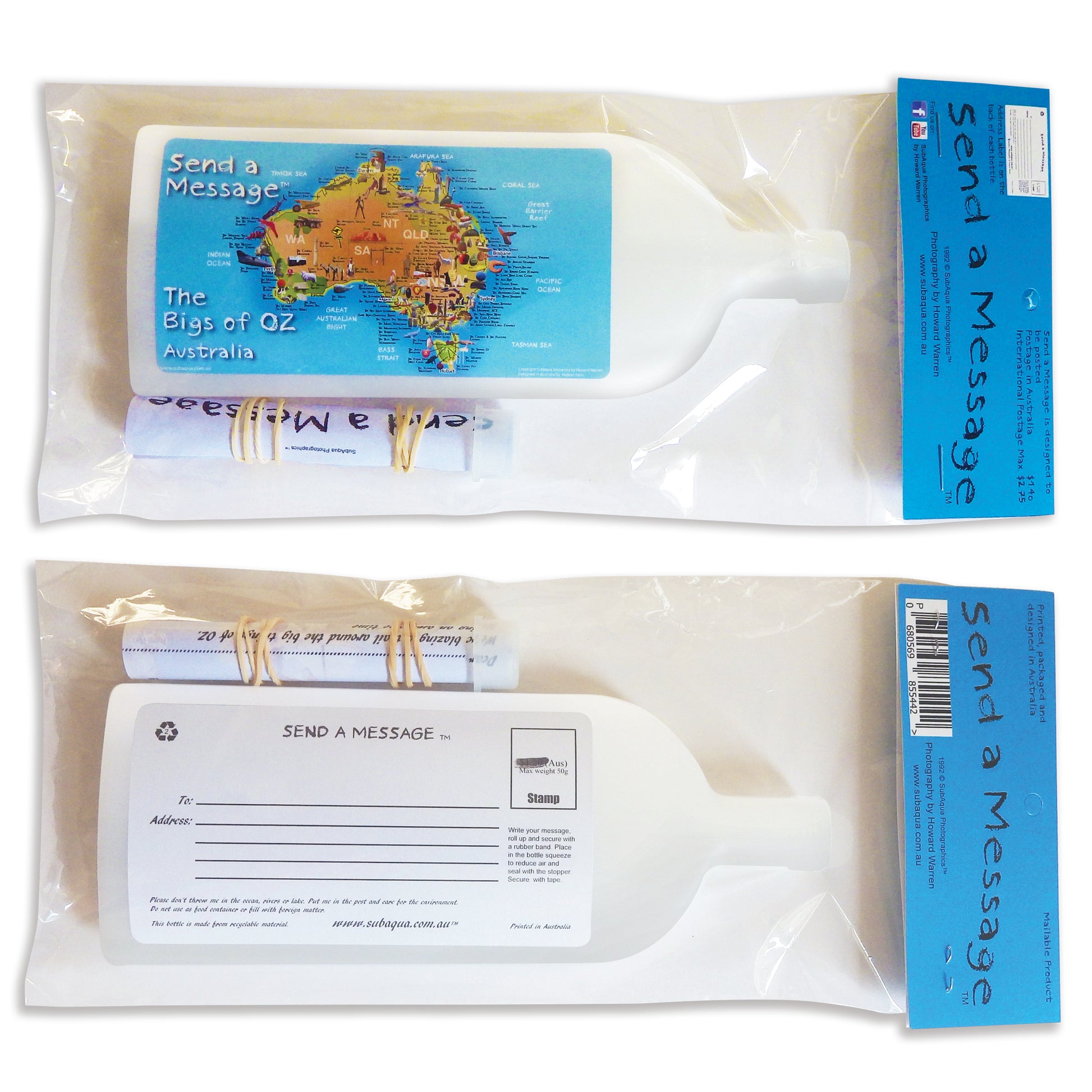 The Big things of Oz Message Bottle will be a new and exciting way to send to you friends and family during your travelling around the Big Things . Featuring Australia’s most iconic big things across every state and territory. Australian designed and printed with its own special message where you can list the various Big Things you visited .You can post your friends or family this customized message in our mailing bottle. Presented in a hang sell pack. Perfect for gifting.